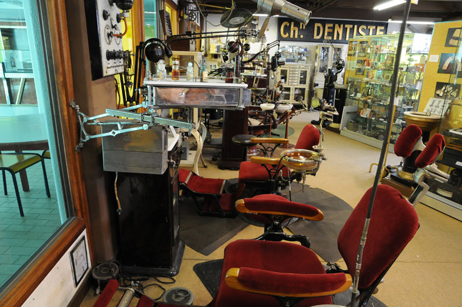 A remarkable series of dentist chairs from the (19th century until now) shows the changes of the ergonomics of dental practices. Around twenty display cases show dental and surgical instruments, prostheses, dental x-ray equipment etc.