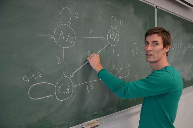 Au croisement des mathématiques et de l’informatique prennent place les automates. Expliqués grossièrement, il s’agit de processus permettant d’effectuer des calculs simples. En somme, un automate est fait d’états successifs et selon ce qu’on lui fournit comme donnée, il passe ou pas, d’un état à un autre. Il ne dispose pas de mémoire : seul son état au temps t nous renseigne partiellement sur les données qu’il a traitées. Pour Boris Adamczewski , ? On peut penser un automate fini comme un ordinateur appauvri à l’extrême ?. Mais ce lauréat ERC n’est pas informaticien : il manipule ses outils de manière théorique avec le regard d’un mathématicien.